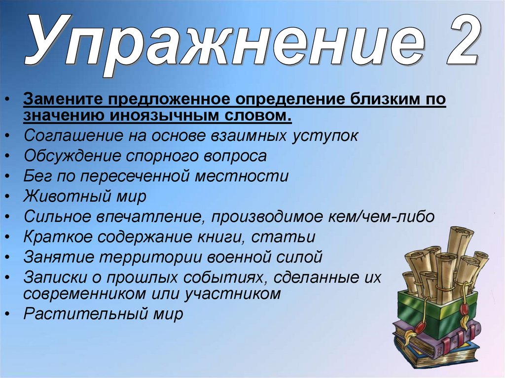 • Замените предложенное определение близким позначению иноязычным словом.
