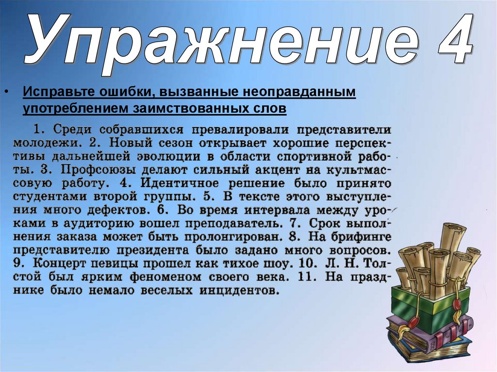 • Исправьте ошибки, вызванные неоправданнымупотреблением заимствованных слов