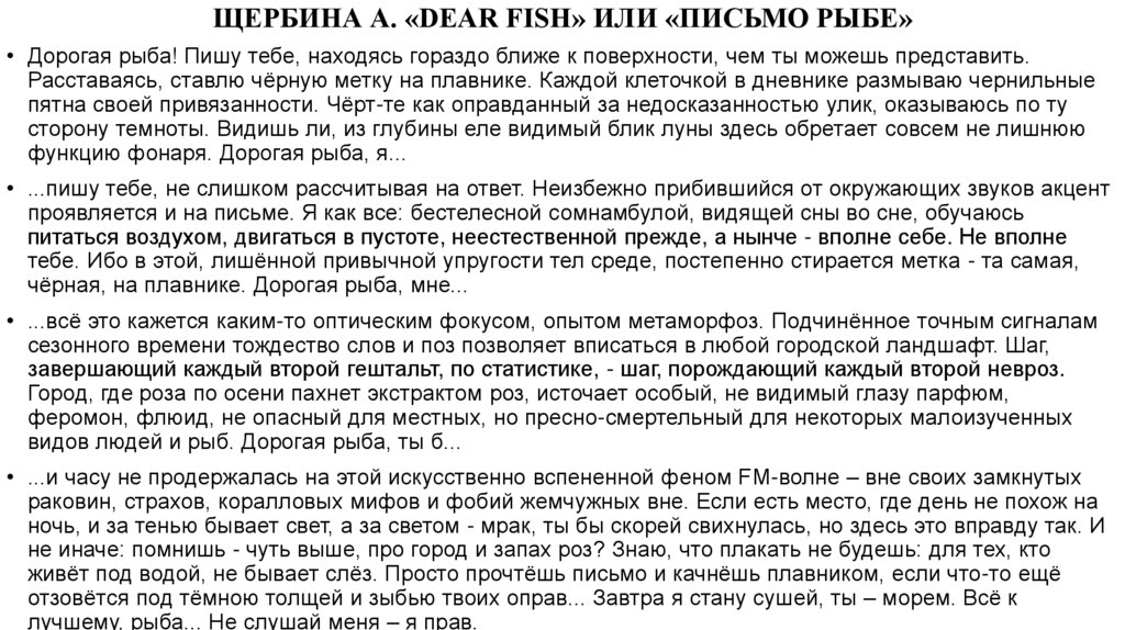 ЩЕРБИНА А. «DEAR FISH» ИЛИ «ПИСЬМО РЫБЕ»• Дорогая рыба! Пишу тебе, находясь гораздо ближе к поверхности, чем ты можешь представить.