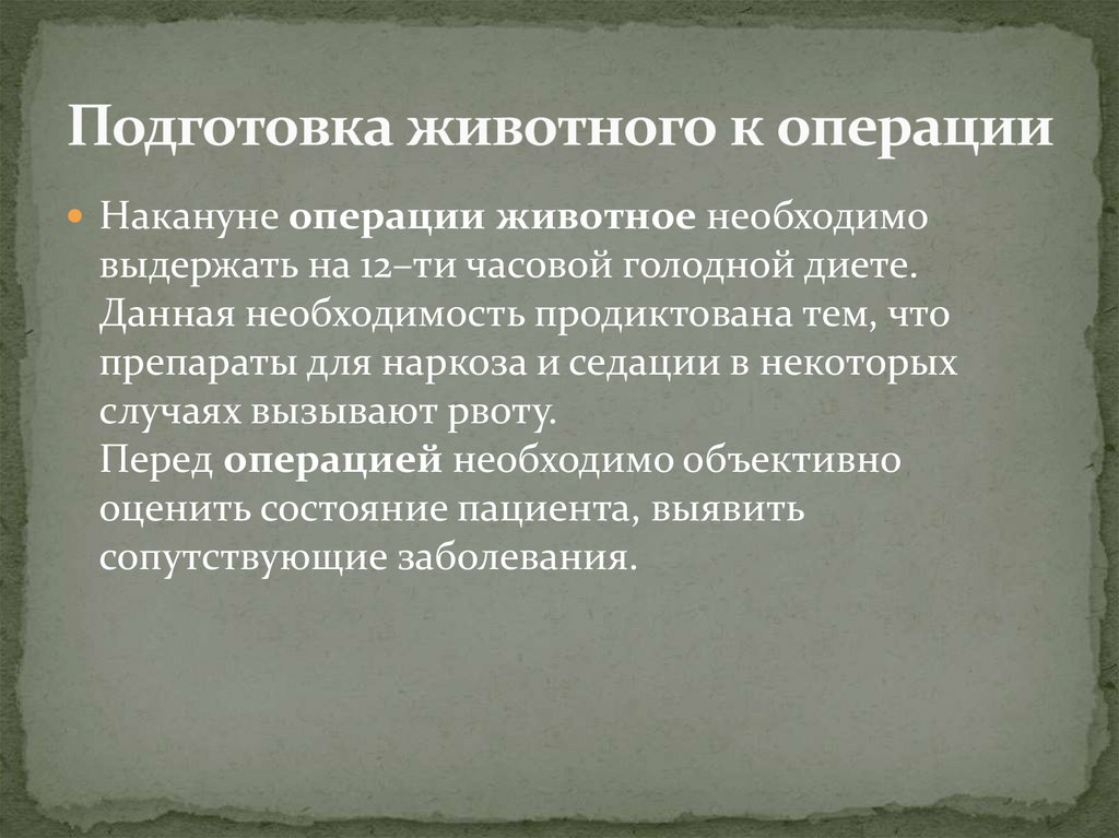Накануне операции животное необходимовыдержать на 12–ти часовой голодной диете.