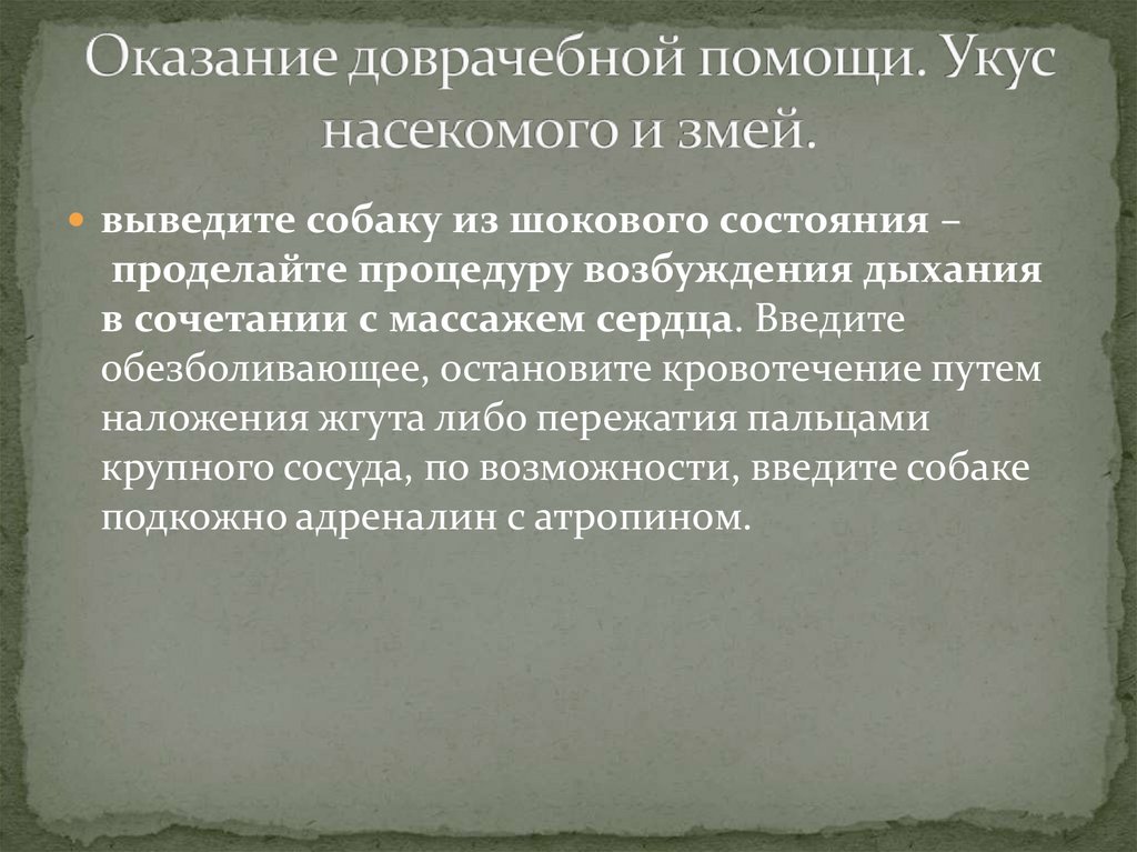 выведите собаку из шокового состояния –проделайте процедуру возбуждения дыхания