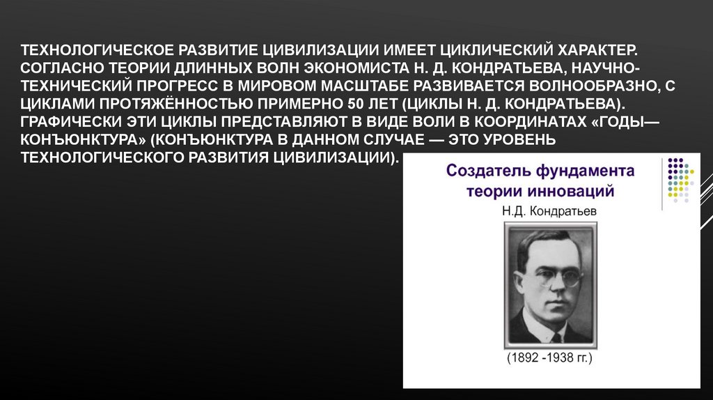 ТЕХНОЛОГИЧЕСКОЕ РАЗВИТИЕ ЦИВИЛИЗАЦИИ ИМЕЕТ ЦИКЛИЧЕСКИЙ ХАРАКТЕР.СОГЛАСНО ТЕОРИИ ДЛИННЫХ ВОЛН ЭКОНОМИСТА Н. Д. КОНДРАТЬЕВА, НАУЧНОТЕХНИЧЕСКИЙ ПРОГРЕСС В МИРОВОМ МАСШТАБЕ РАЗВИВАЕТСЯ ВОЛНООБРАЗНО, С