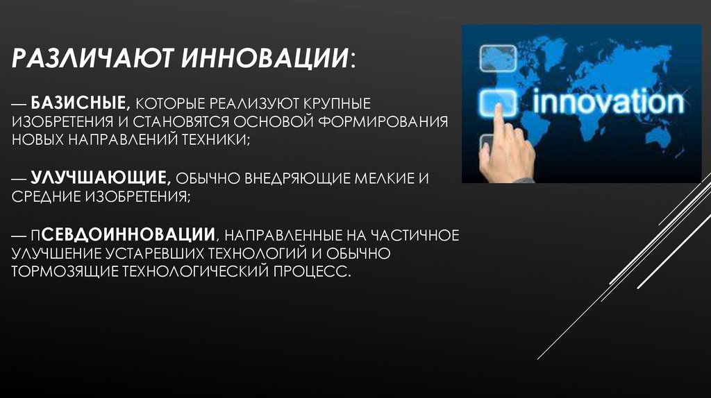 РАЗЛИЧАЮТ ИННОВАЦИИ:— БАЗИСНЫЕ, КОТОРЫЕ РЕАЛИЗУЮТ КРУПНЫЕ