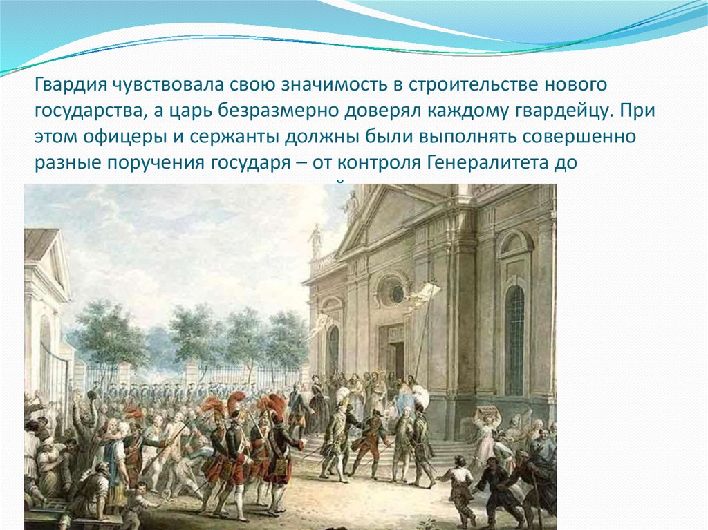 Гвардия чувствовала свою значимость в строительстве новогогосударства, а царь безразмерно доверял каждому гвардейцу. При