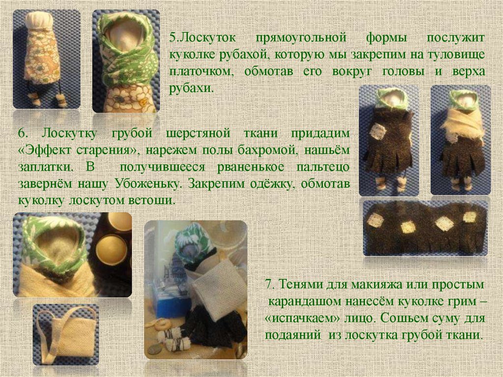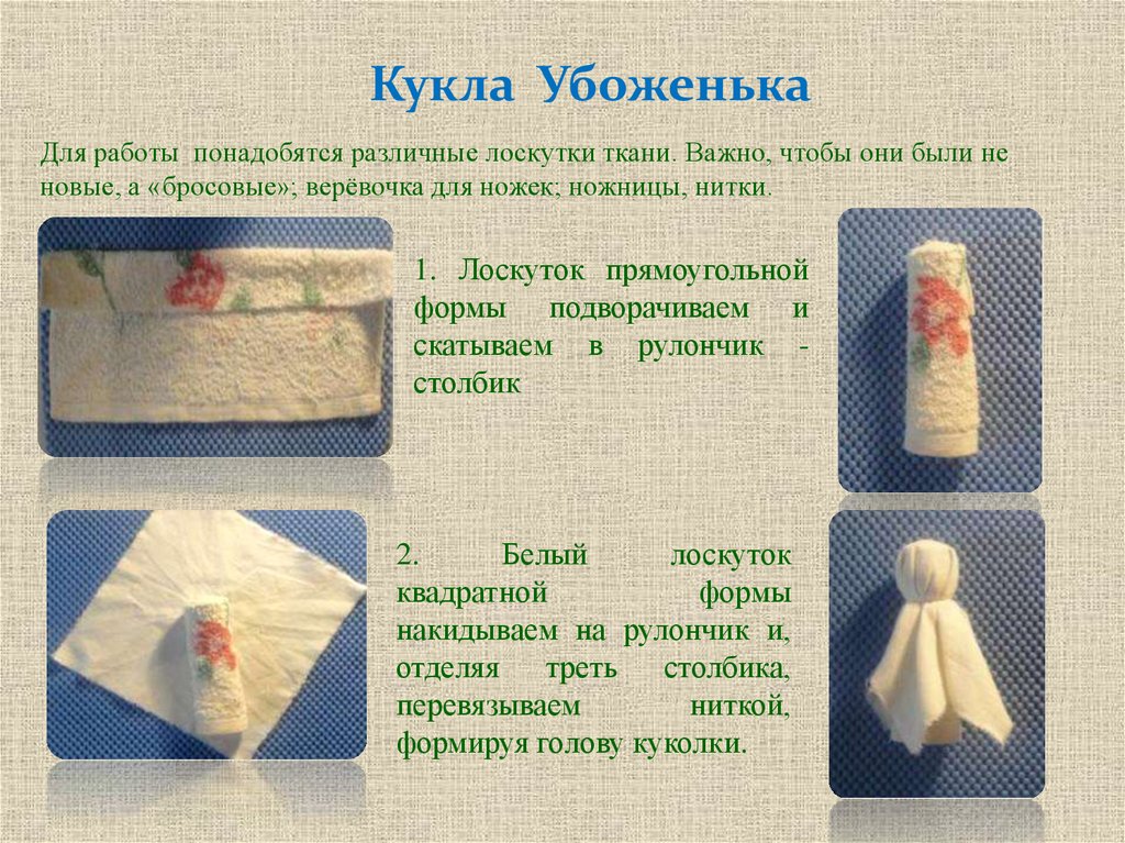 Кукла УбоженькаДля работы понадобятся различные лоскутки ткани. Важно, чтобы они были не