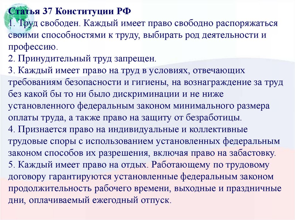 Статья 37 Конституции РФ1. Труд свободен. Каждый имеет право свободно распоряжаться