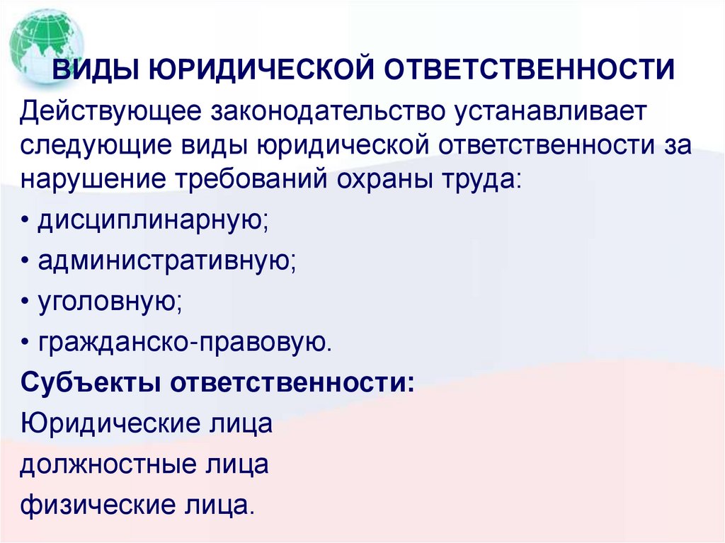 ВИДЫ ЮРИДИЧЕСКОЙ ОТВЕТСТВЕННОСТИДействующее законодательство устанавливает