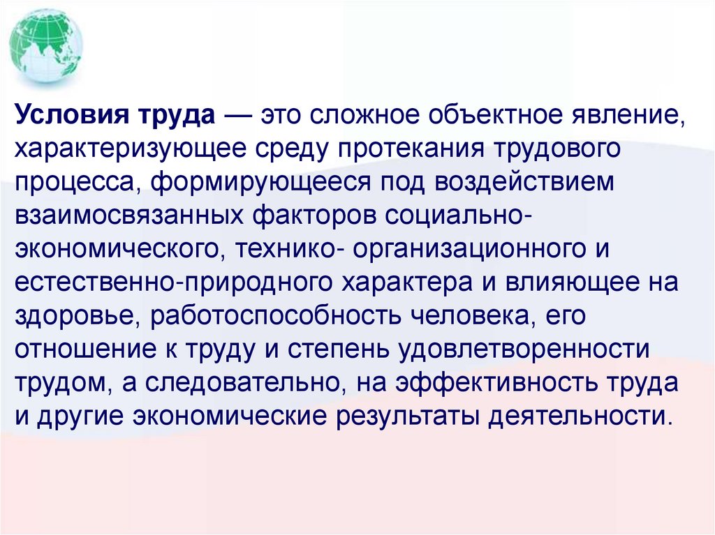 Условия труда — это сложное объектное явление,характеризующее среду протекания трудового