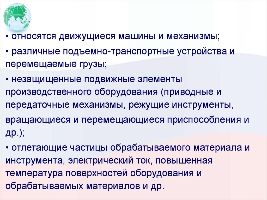 • относятся движущиеся машины и механизмы;• различные подъемно-транспортные устройства и
