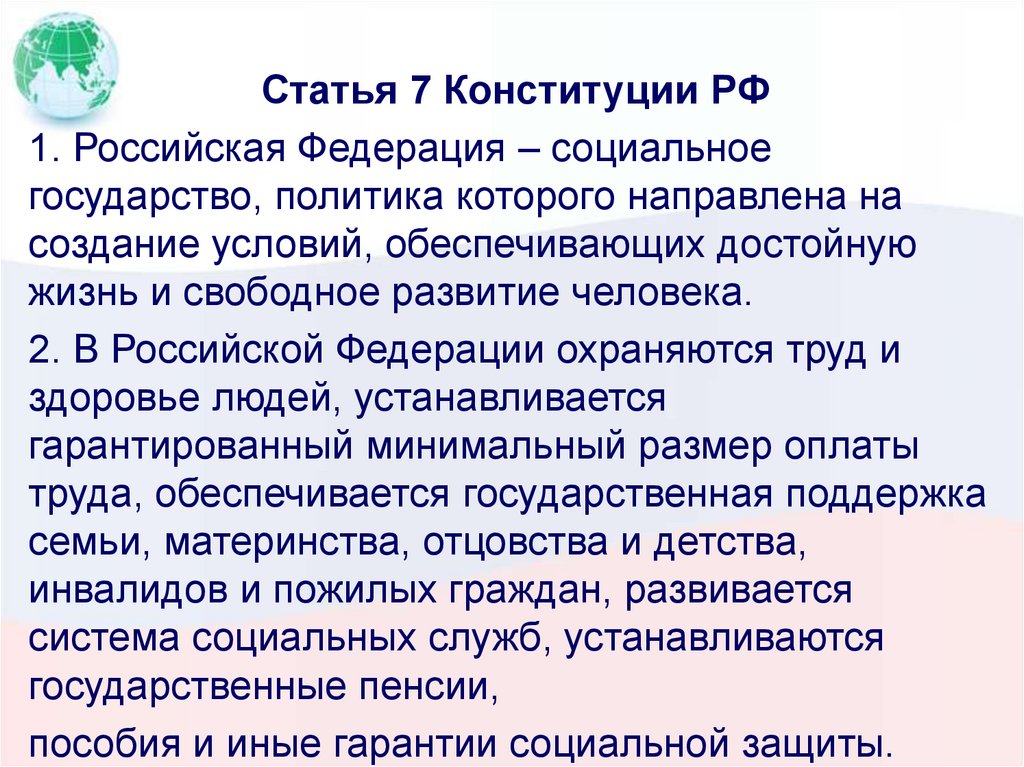 Статья 7 Конституции РФ1. Российская Федерация – социальное