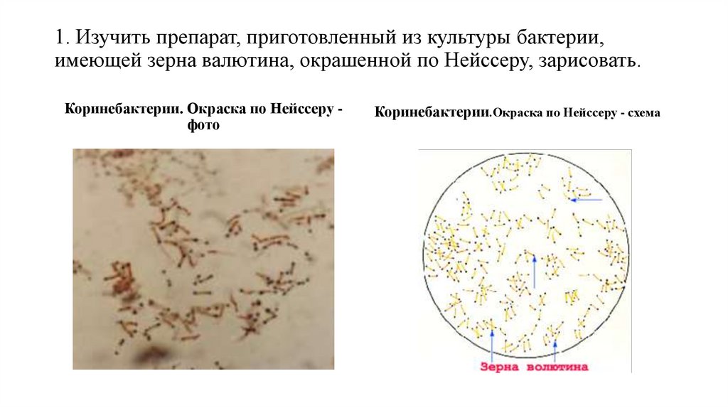 1. Изучить препарат, приготовленный из культуры бактерии,имеющей зерна валютина, окрашенной по Нейссеру, зарисовать.