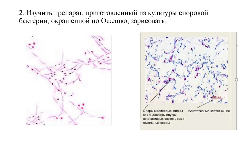 2. Изучить препарат, приготовленный из культуры споровойбактерии, окрашенной по Ожешко, зарисовать.