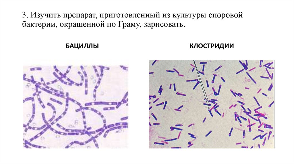 3. Изучить препарат, приготовленный из культуры споровойбактерии, окрашенной по Граму, зарисовать.