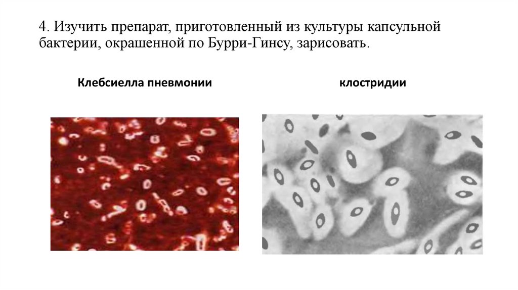 4. Изучить препарат, приготовленный из культуры капсульнойбактерии, окрашенной по Бурри-Гинсу, зарисовать.