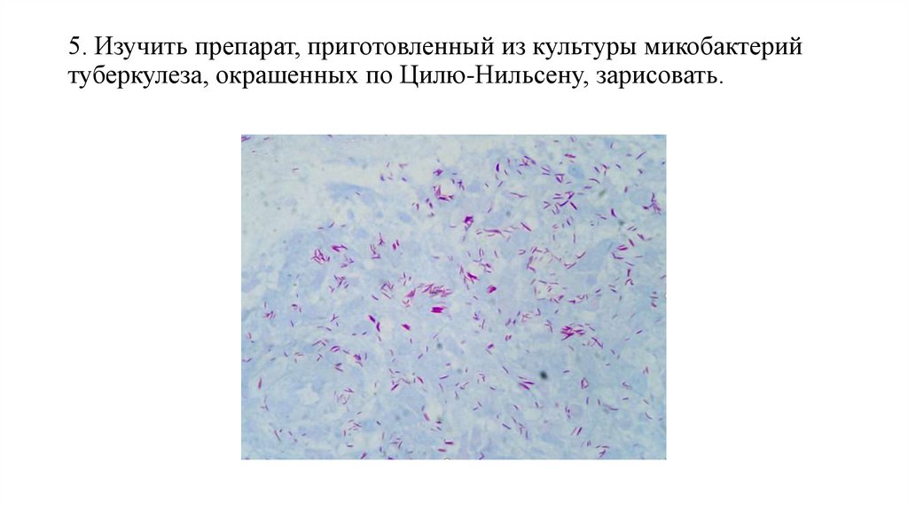 5. Изучить препарат, приготовленный из культуры микобактерийтуберкулеза, окрашенных по Цилю-Нильсену, зарисовать.