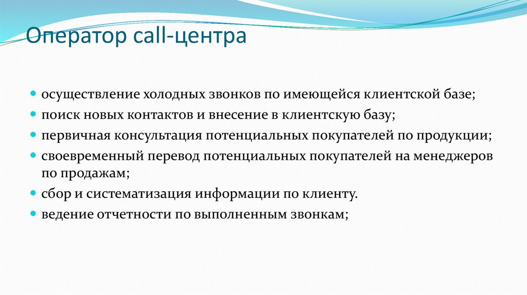 Оператор call-центраосуществление холодных звонков по имеющейся клиентской базе;