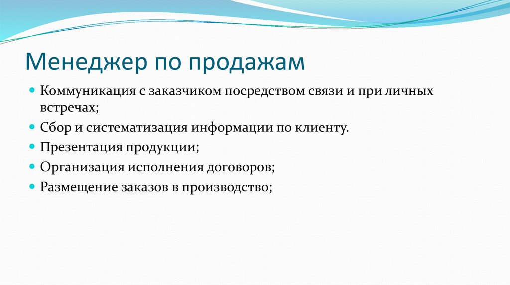 Менеджер по продажамКоммуникация с заказчиком посредством связи и при личных