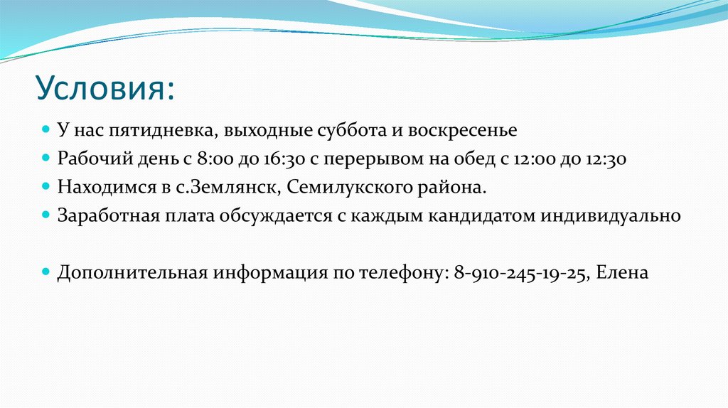 Условия:У нас пятидневка, выходные суббота и воскресенье
