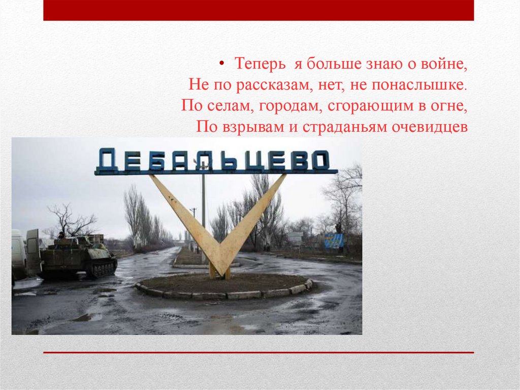 • Теперь я больше знаю о войне,Не по рассказам, нет, не понаслышке.