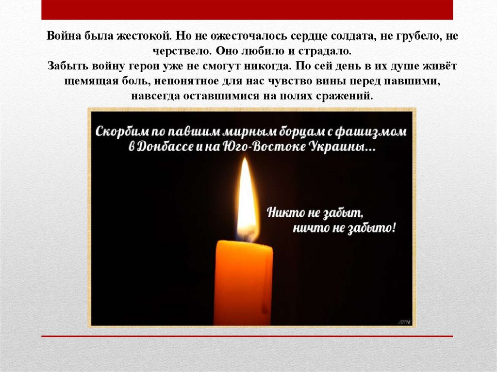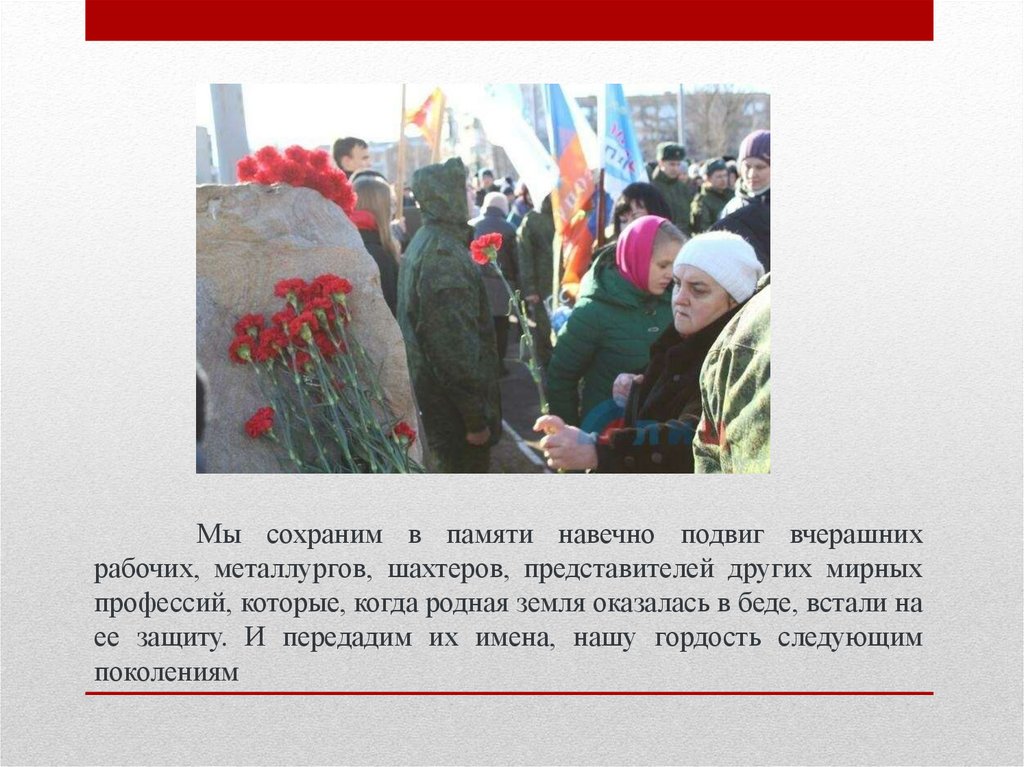 Мы сохраним в памяти навечно подвиг вчерашнихрабочих, металлургов, шахтеров, представителей других мирных