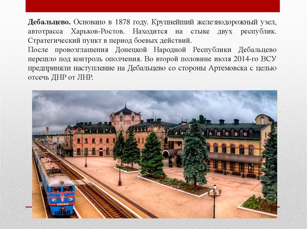 Дебальцево. Основано в 1878 году. Крупнейший железнодорожный узел,автотрасса Харьков-Ростов. Находится на стыке двух республик.