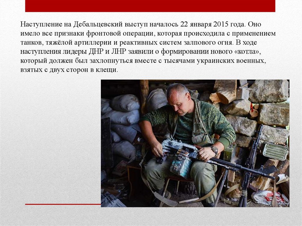 Наступление на Дебальцевский выступ началось 22 января 2015 года. Оноимело все признаки фронтовой операции, которая происходила с применением