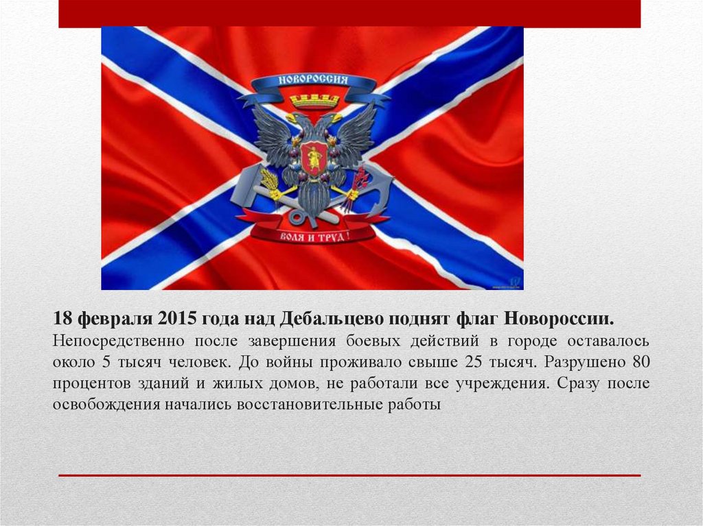 18 февраля 2015 года над Дебальцево поднят флаг Новороссии.Непосредственно после завершения боевых действий в городе оставалось