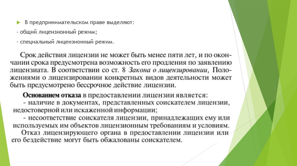 В предпринимательском праве выделяют:- общий лицензионный режим;