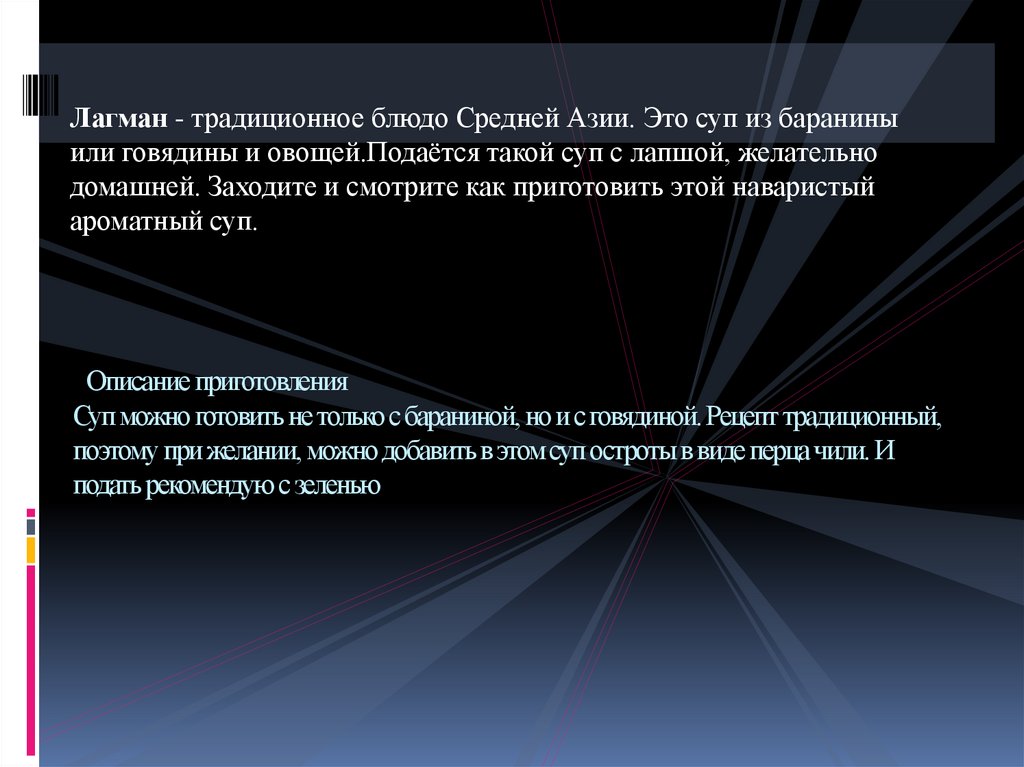 Лагман - традиционное блюдо Средней Азии. Это суп из бараниныили говядины и овощей.Подаётся такой суп с лапшой, желательно
