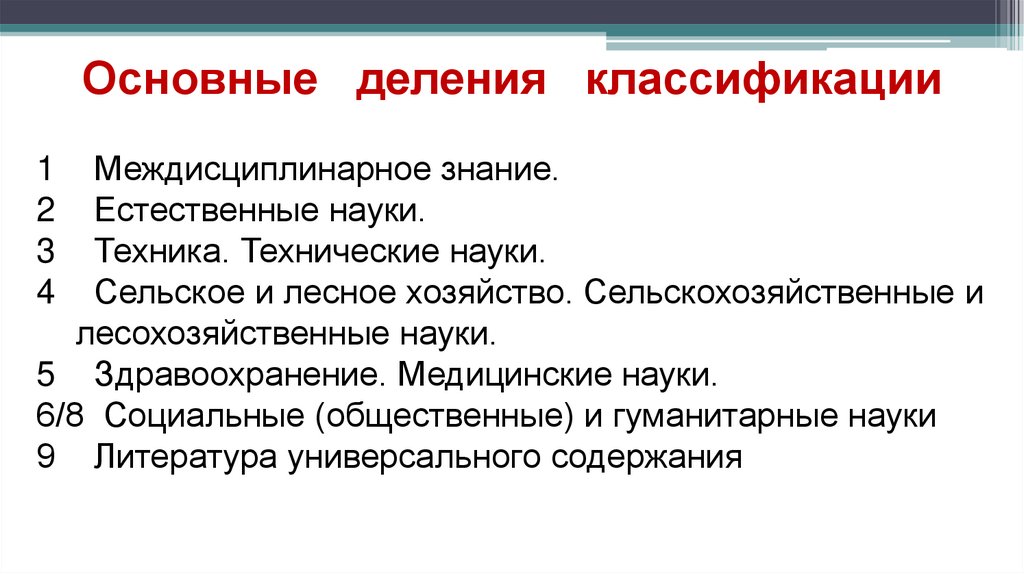 Основные деления классификацииМеждисциплинарное знание.