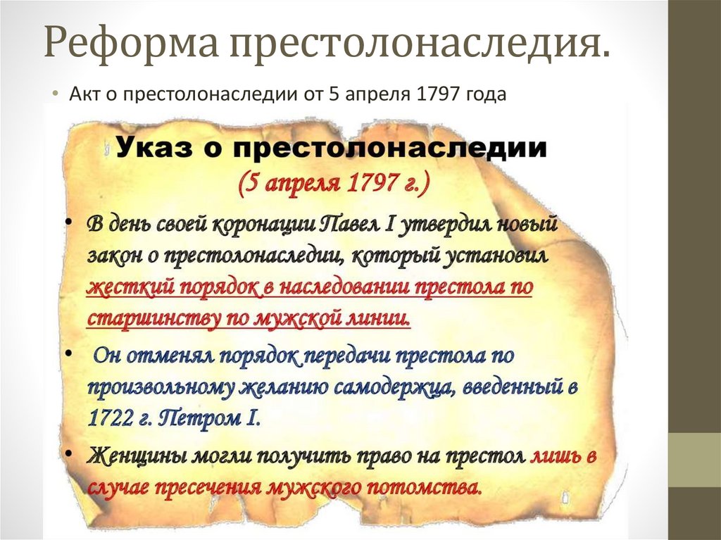 Реформа престолонаследия.• Акт о престолонаследии от 5 апреля 1797 года