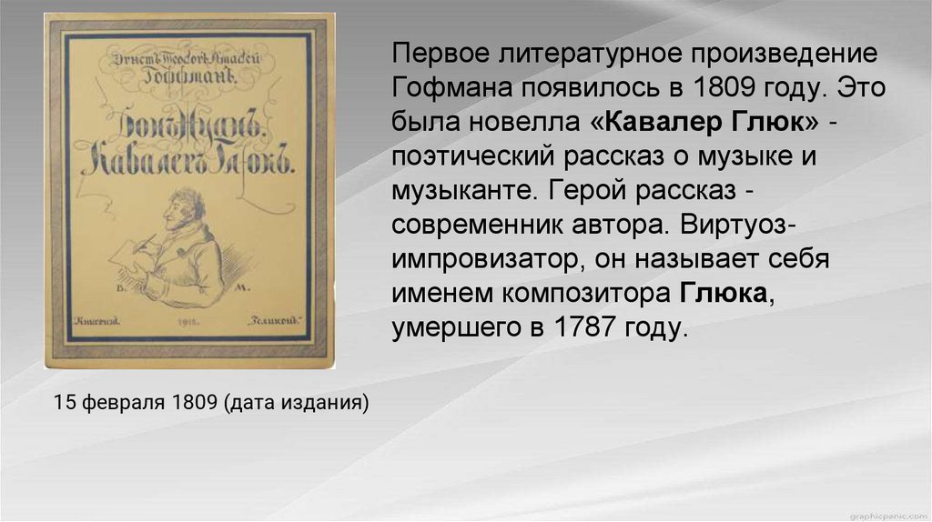 Первое литературное произведениеГофмана появилось в 1809 году. Это