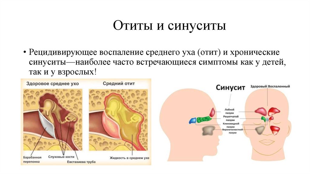 Отиты и синуситы• Рецидивирующее воспаление среднего уха (отит) и хронические