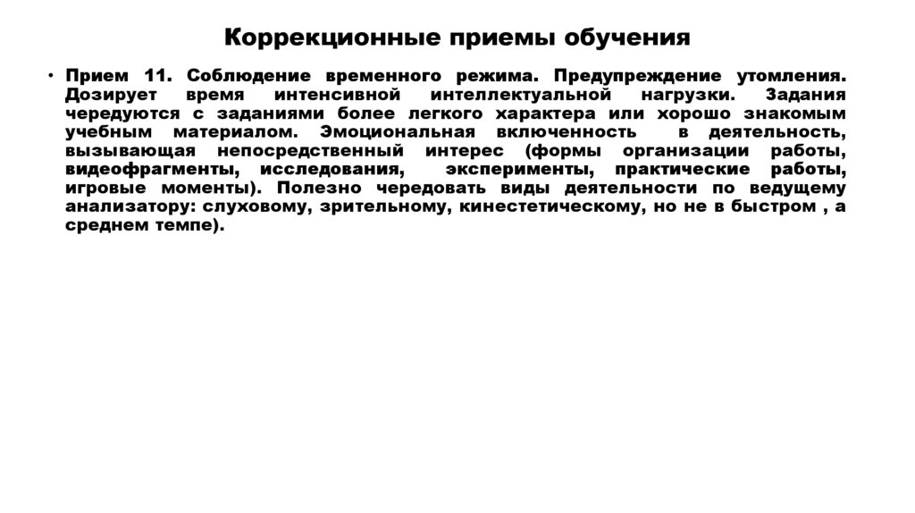 Коррекционные приемы обучения• Прием 11. Соблюдение временного режима. Предупреждение утомления.