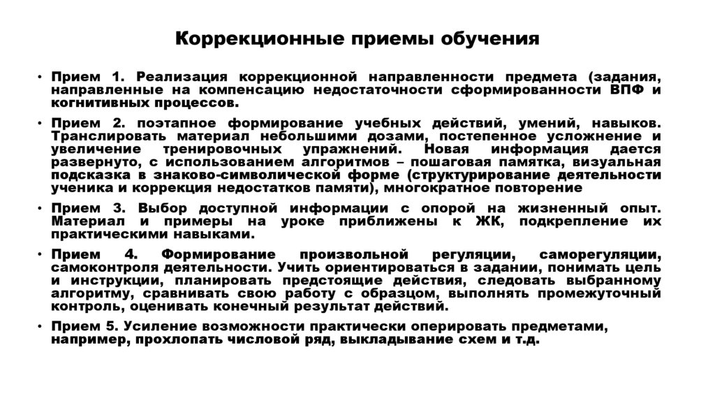 Коррекционные приемы обучения• Прием 1. Реализация коррекционной направленности предмета (задания,