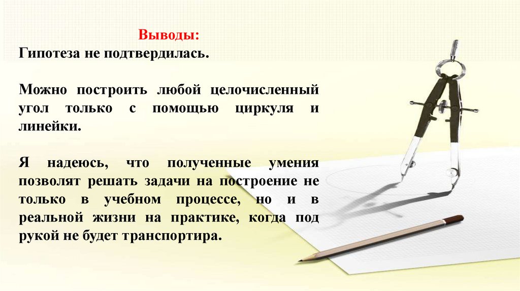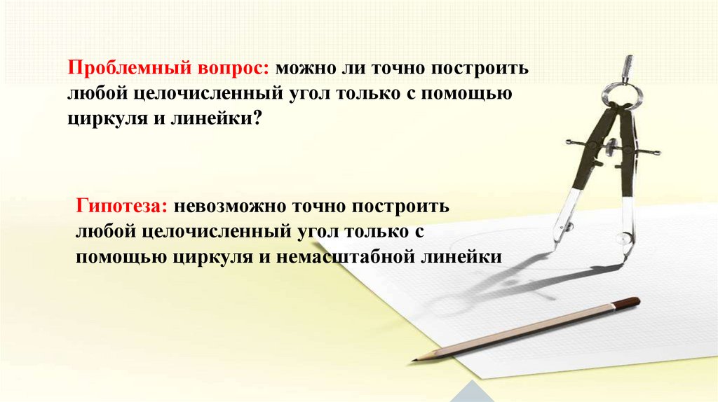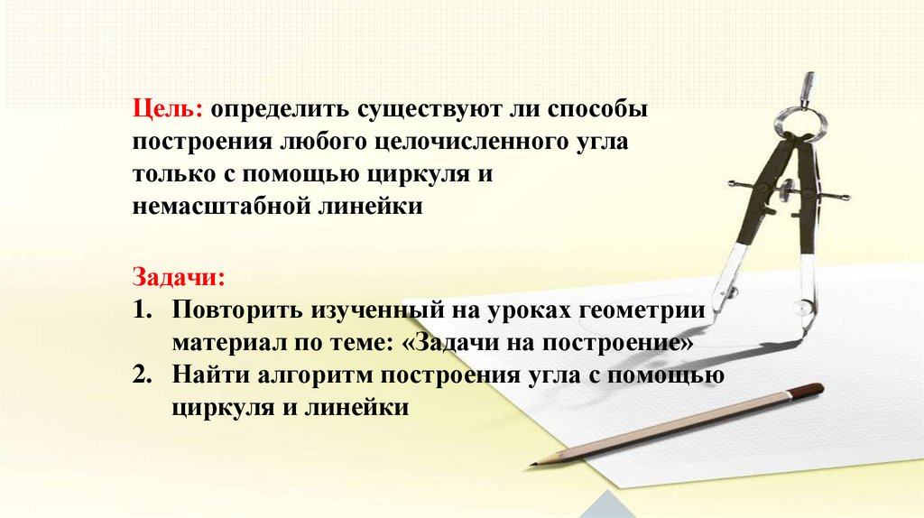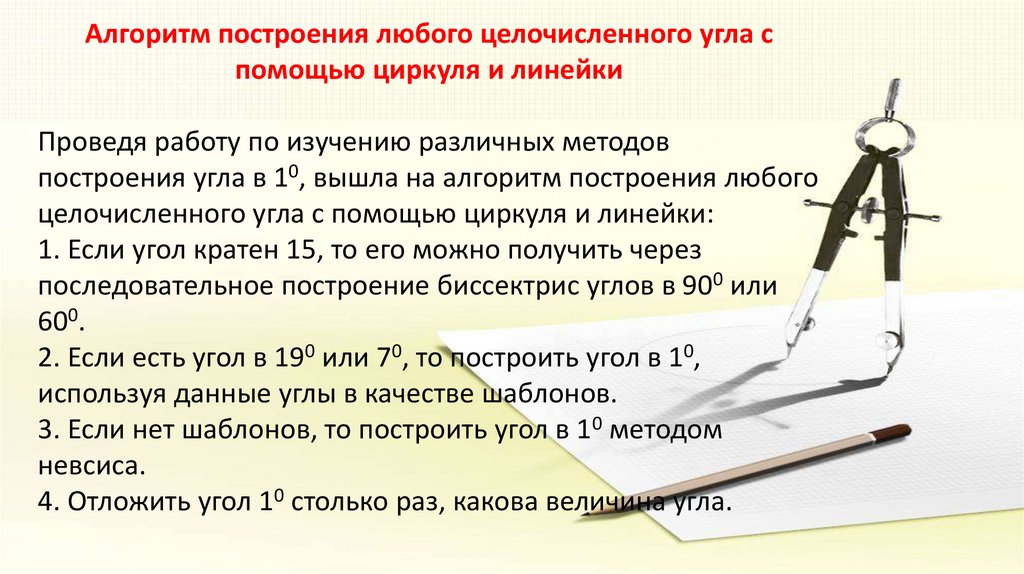 Цель: определить существуют ли способыпостроения любого целочисленного угла