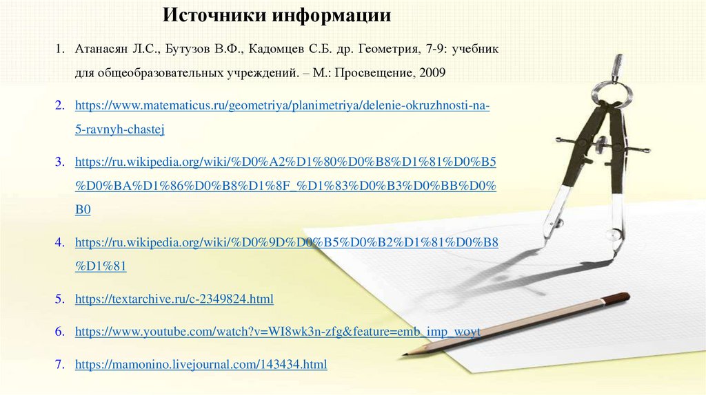 2. https://www.matematicus.ru/geometriya/planimetriya/delenie-okruzhnosti-na5-ravnyh-chastej