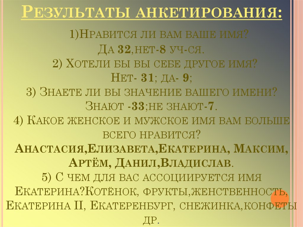 РЕЗУЛЬТАТЫ АНКЕТИРОВАНИЯ:1)НРАВИТСЯ ЛИ ВАМ ВАШЕ ИМЯ?