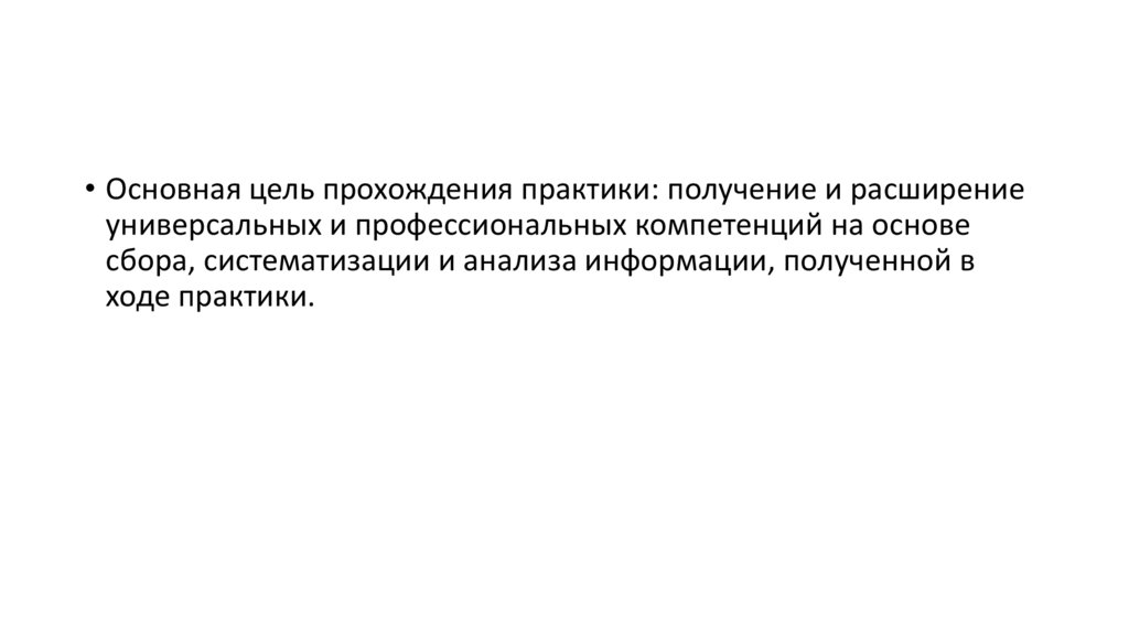 • Основная цель прохождения практики: получение и расширениеуниверсальных и профессиональных компетенций на основе