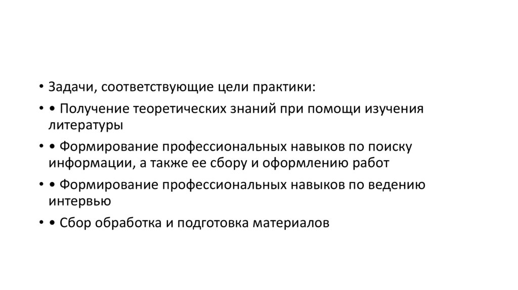 • Задачи, соответствующие цели практики:• • Получение теоретических знаний при помощи изучения