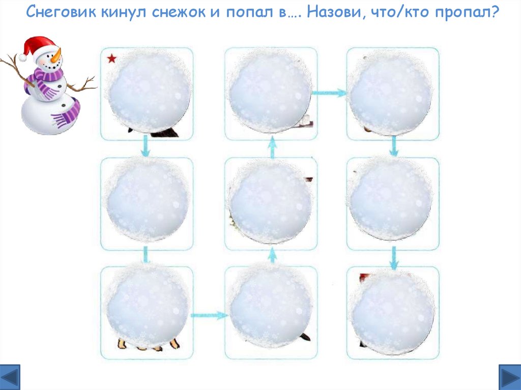 Снеговик кинул снежок и попал в…. Назови, что/кто пропал?