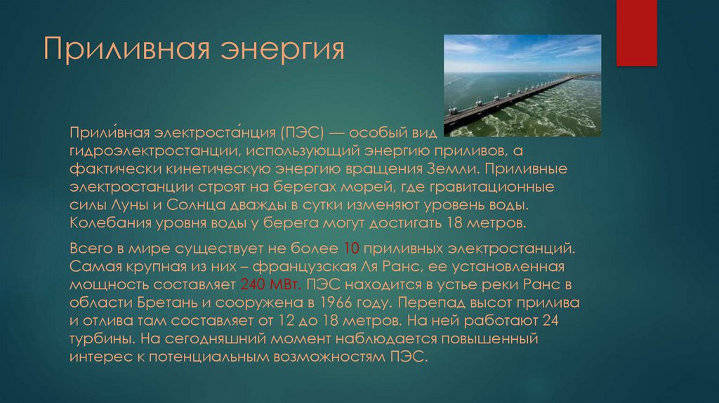 Приливная энергияПрили́вная электроста́нция (ПЭС) — особый вид