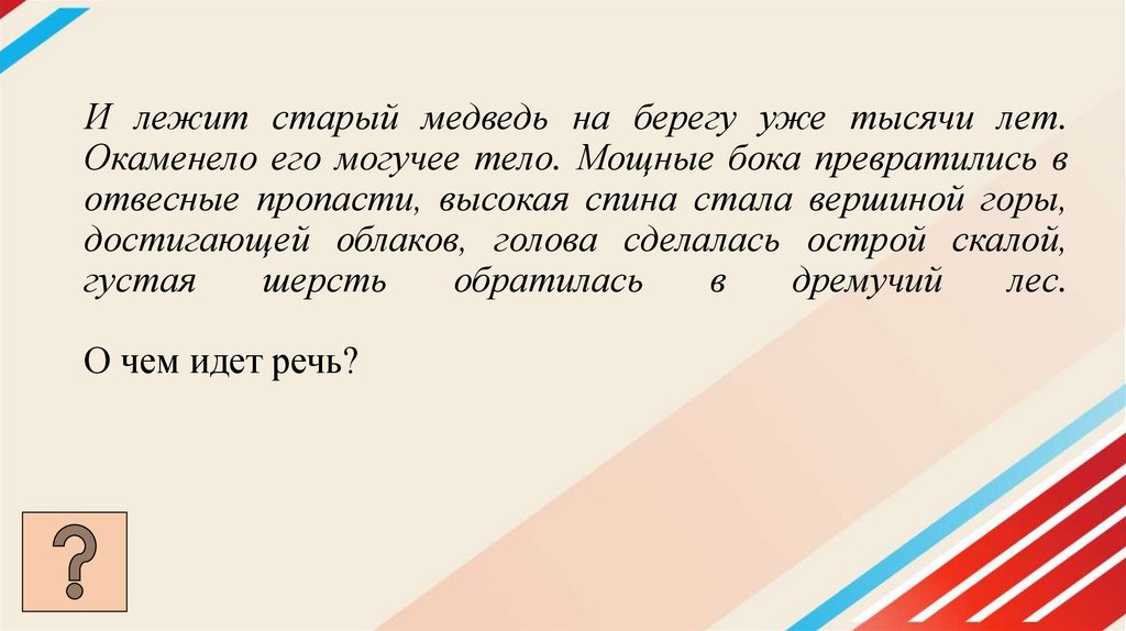 И лежит старый медведь на берегу уже тысячи лет.Окаменело его могучее тело. Мощные бока превратились в