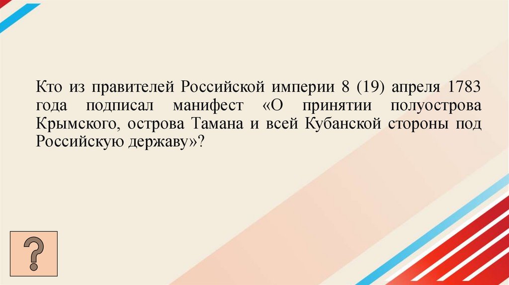 Кто из правителей Российской империи 8 (19) апреля 1783года подписал манифест «О принятии полуострова