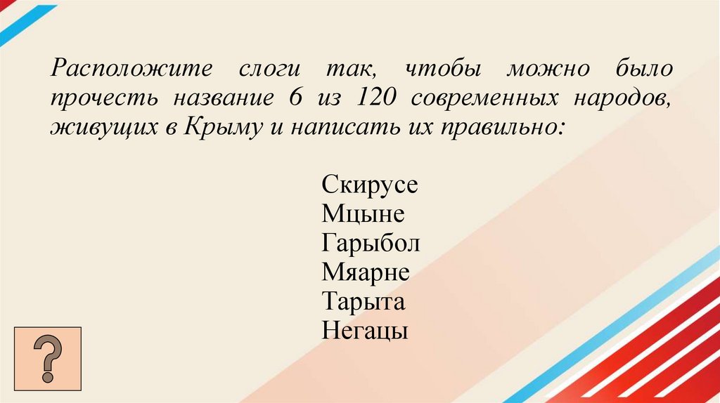 Расположите слоги так, чтобы можно былопрочесть название 6 из 120 современных народов,