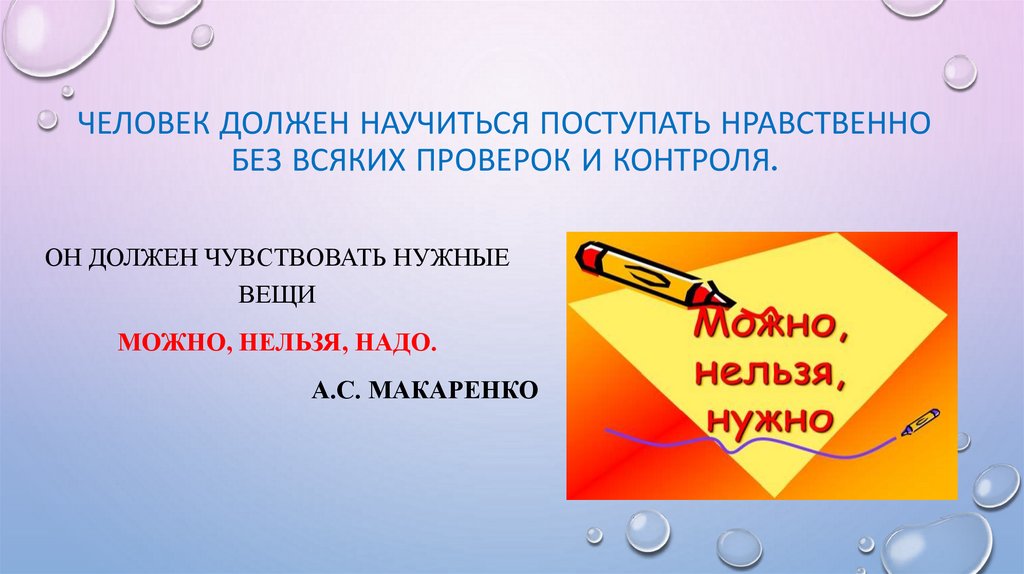 ЧЕЛОВЕК ДОЛЖЕН НАУЧИТЬСЯ ПОСТУПАТЬ НРАВСТВЕННОБЕЗ ВСЯКИХ ПРОВЕРОК И КОНТРОЛЯ.
