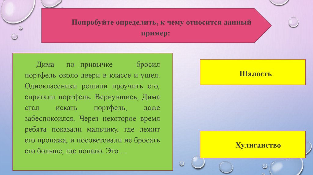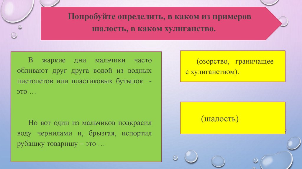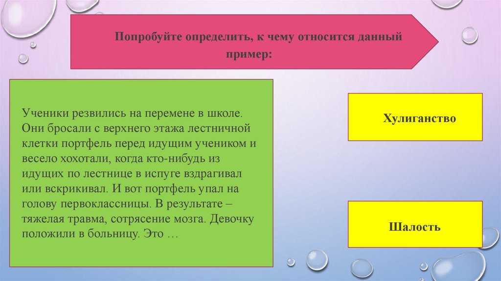 Попробуйте определить, в каком из примеровшалость, в каком хулиганство.
