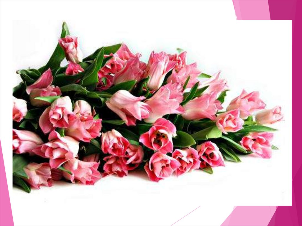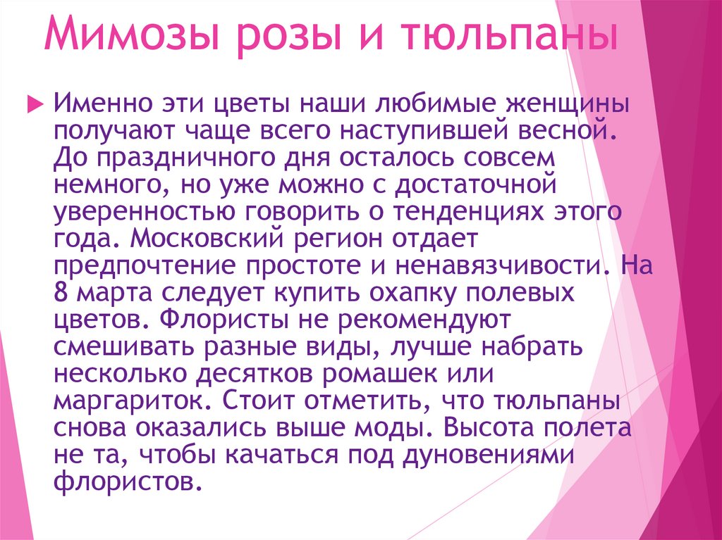 Мимозы розы и тюльпаныИменно эти цветы наши любимые женщины