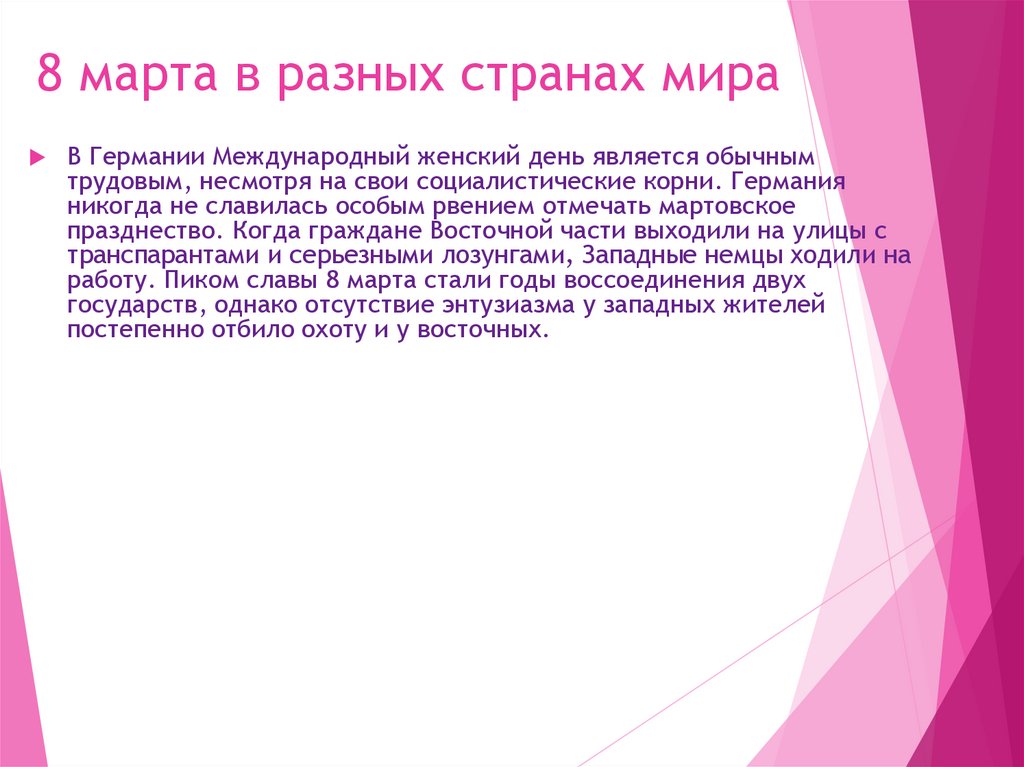 8 марта в разных странах мираВ Германии Международный женский день является обычным
