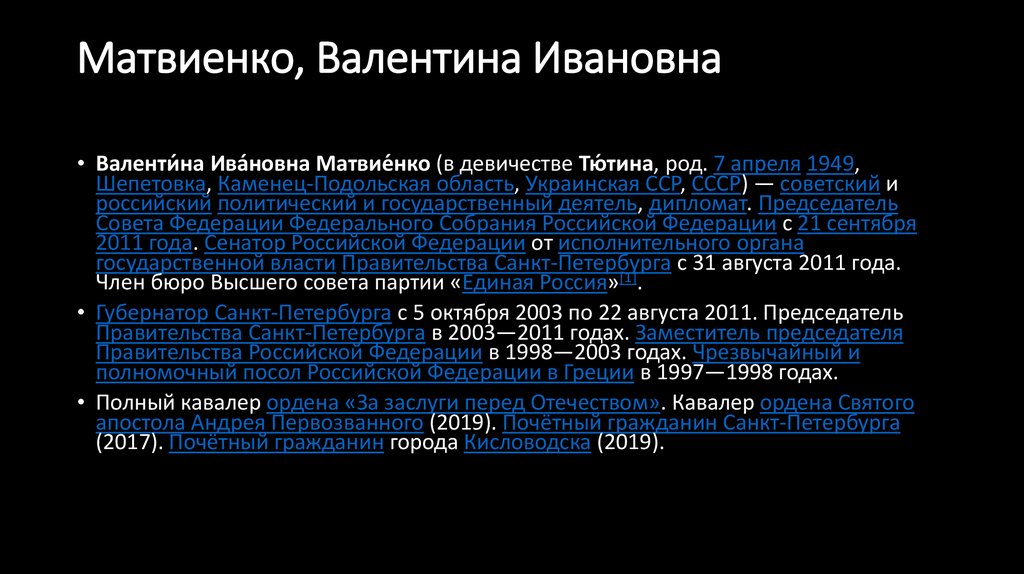 Матвиенко, Валентина Ивановна• Валенти́ на Ива́новна Матвие́нко (в девичестве Тю́ тина, род. 7 апреля 1949,